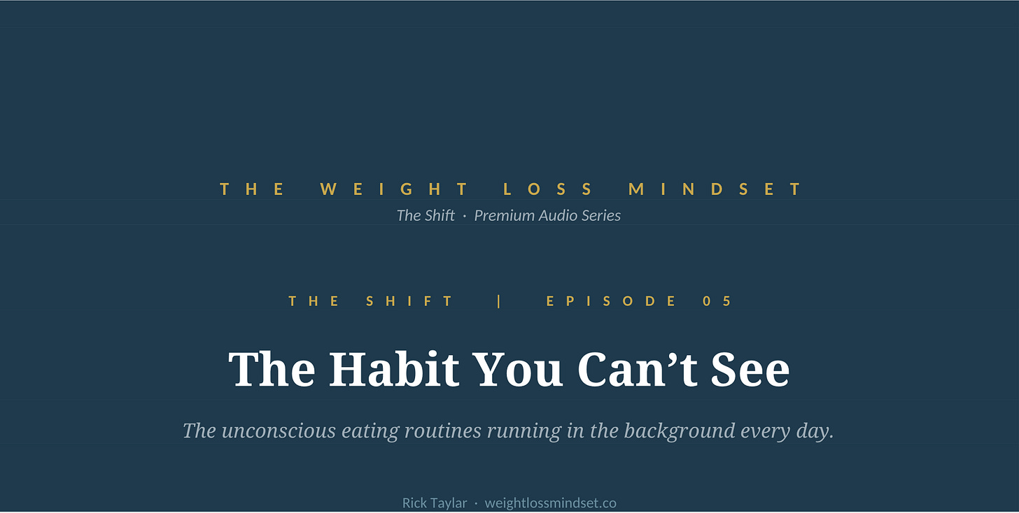 The ShiftThe Habit You Can’t SeeWed April 15th, 2026Rick TaylarApr 17, 2026∙ Paid1ShareAt some point today, you ate something you didn’t decide to eat.Maybe it was a handful of something grabbed on the way through the kitchen. A few bites finished off someone else’s plate. A snack that…This post is for paid subscribersSubscribeAlready a paid subscriber? Sign inPrevious